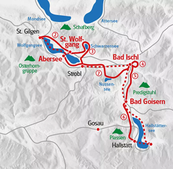 Von St. Wolfgang führt Ihre Route entlang des Sattlweges zum Schwarzensee, wo die Seehütte der Lore mit Köstlichkeiten wartet. Durch die Wirerschlucht ins Tal und um den Bürglstein herum zur Seepromenade in Strobl. Mit dem Bus geht es in die alte Kaiserstadt Bad Ischl.