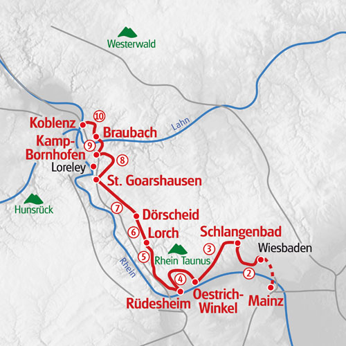 Höhenzüge mit sagenhaften Ausblicken auf den Rhein, Weinberge soweit das Auge reicht, unzählige Burgen und Schlösser, bezauberndes Fachwerk: Das alles und so viel mehr entdecken Sie auf Ihrer Wanderwoche zwischen Mainz und Koblenz. Der Rheingau mit seinen idyllischen Weinlagen und den vielen Straußenwirtschaften lädt zur Verkostung des herrlichen Rieslings. In der UNESCO-Weltkulturerbe-Region Mittelrheingau wandeln Sie entlang der herrschaftlich auf Felsvorsprüngen aufgereihten Höhenburgen auf den Spuren echter Rheinromantik, die bereits Heinrich Heine zur Dichtung seines Loreleyliedes inspirierte. Unglaubliche landschaftliche Schönheit und Kultur – nicht umsonst wurde der Rheinsteig zum schönsten Wanderweg Deutschlands gewählt. Schlichtweg Wandern auf hohem Niveau, im wahrsten Sinne des Wortes!